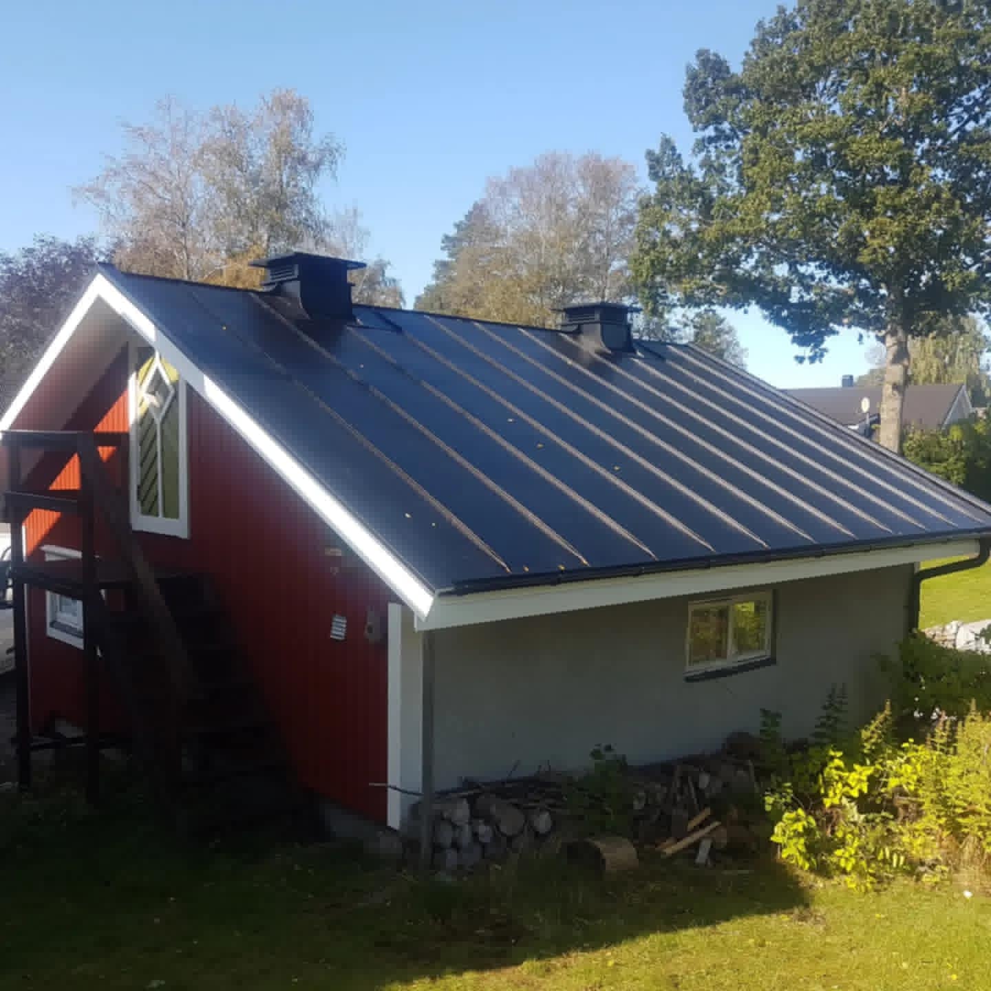 Plåtbeklädnad av garagetak med huvar för luftning av taket till kund i Floda Lerums kommun
